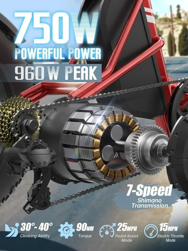 ENHANCED COMFORT AND OFF-ROAD CAPABILITY: The Quadruple Comfort Configuration offers superior riding comfort through a suspension fork, backrest saddle, seatpost springs, and 20" x 4" fat tires. This setup effectively absorbs shocks and bumps, making every ride smoother—whether you're climbing steep 30°–40° inclines or navigating muddy, uneven terrain.